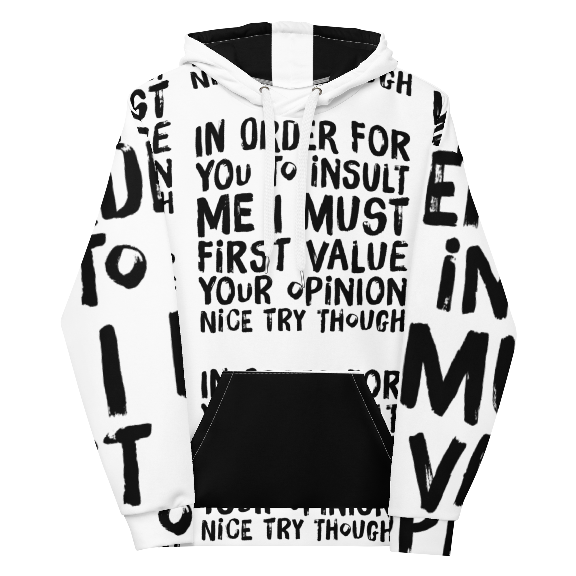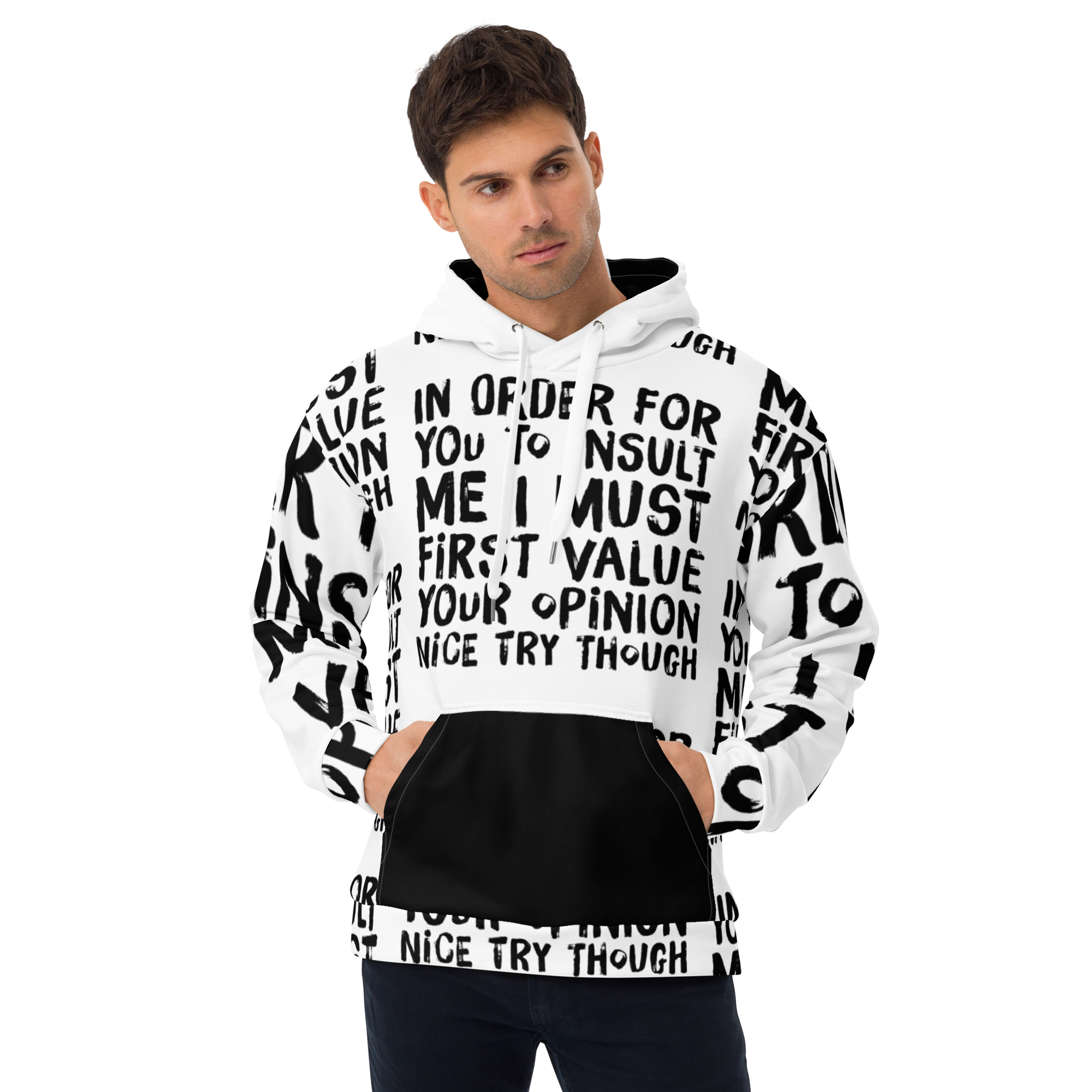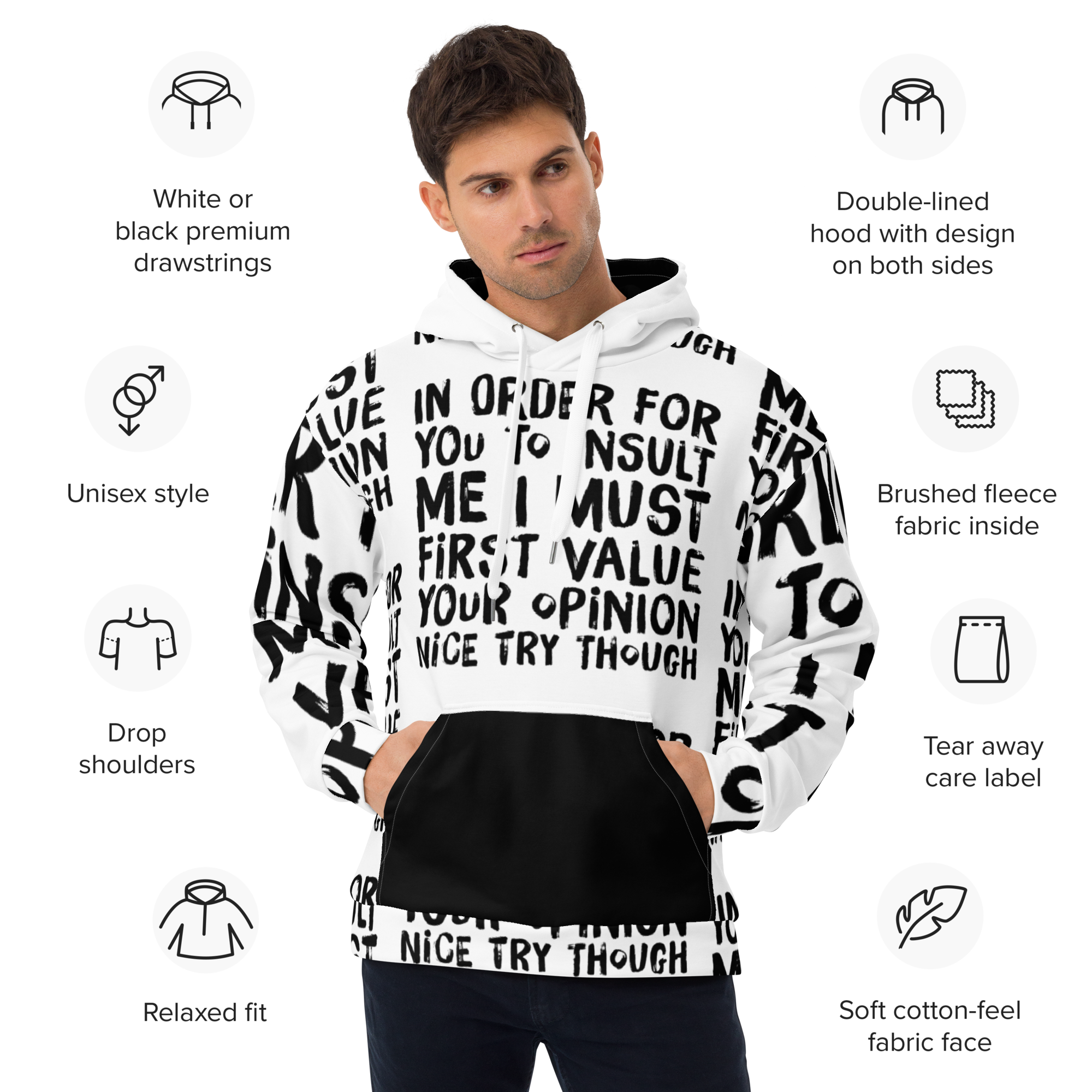 Bold and Stylish: The stark contrast of sleek black ink on crisp white, accentuated with stylish choices like a black front pocket and inside hood, makes this hoodie a head-turner. It’s not just about making a statement with words but with your entire presence.
