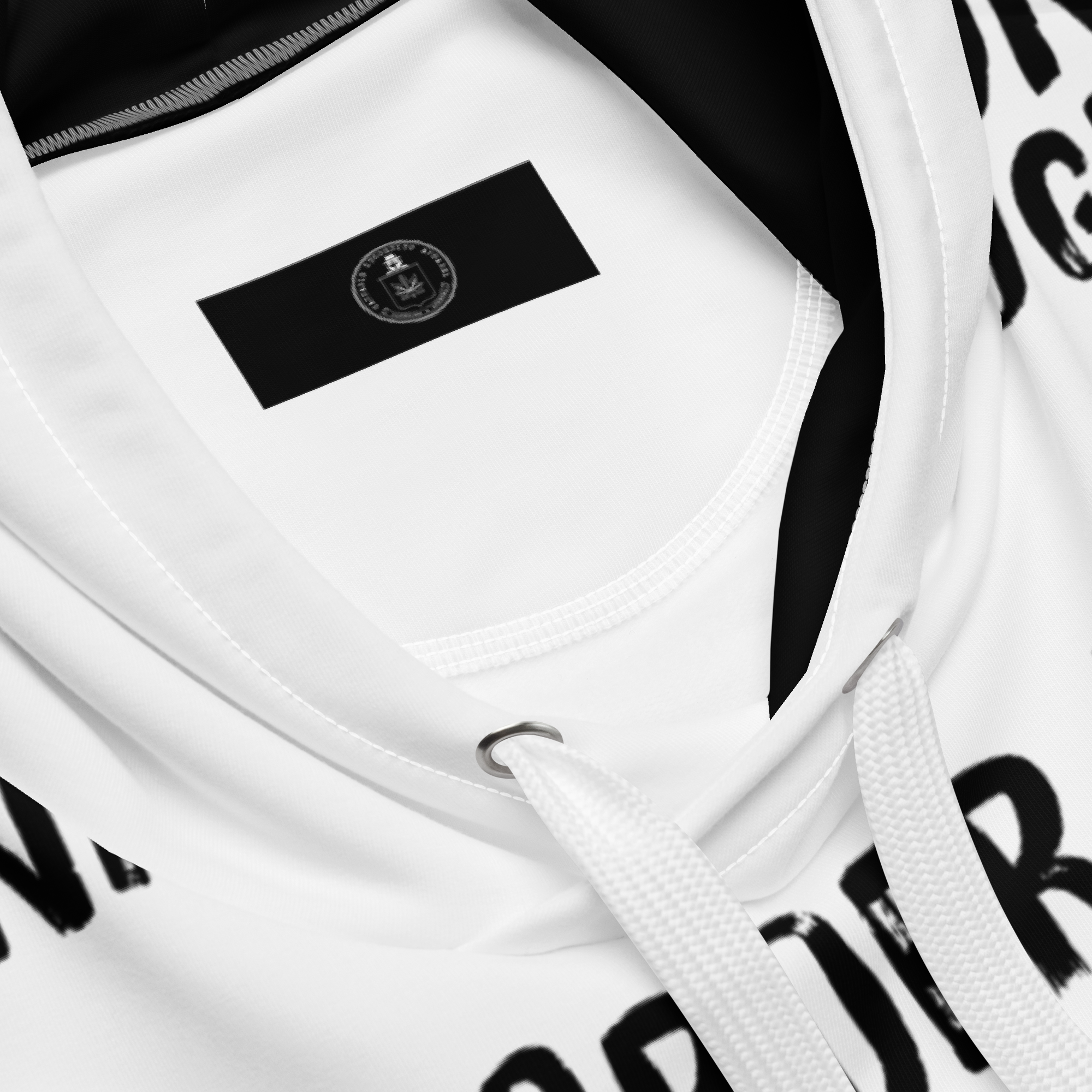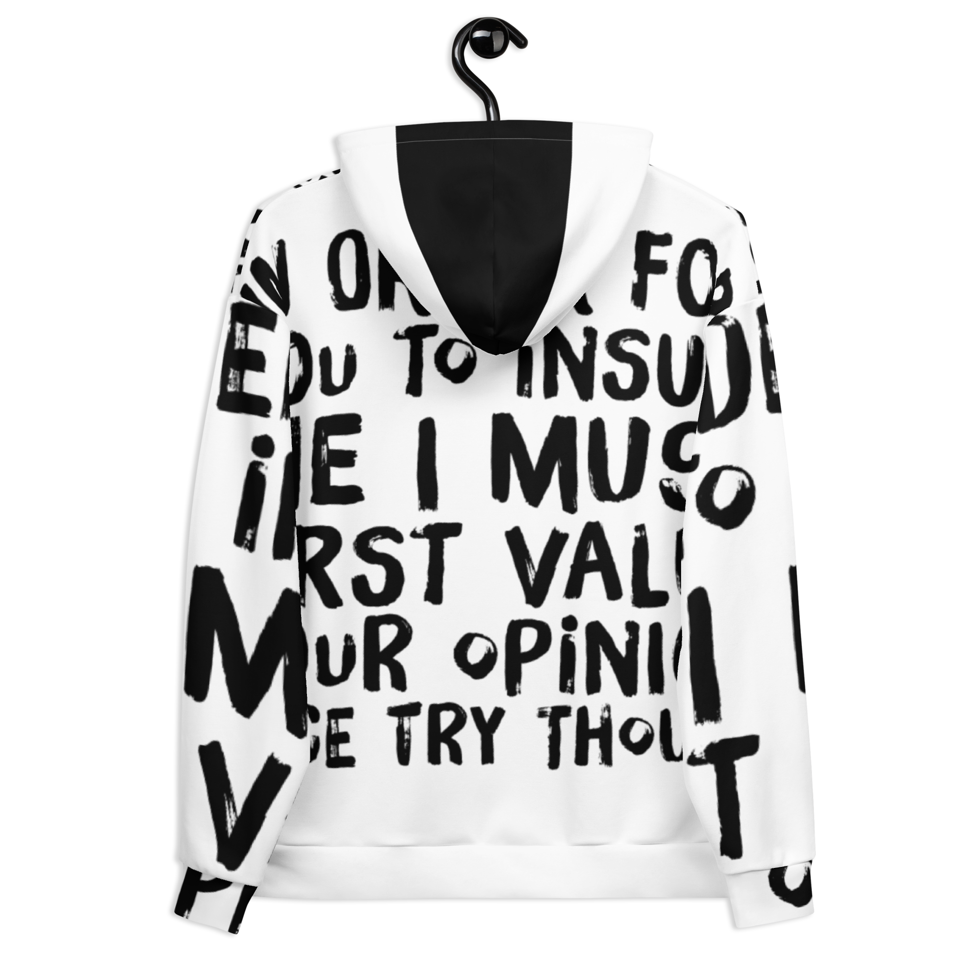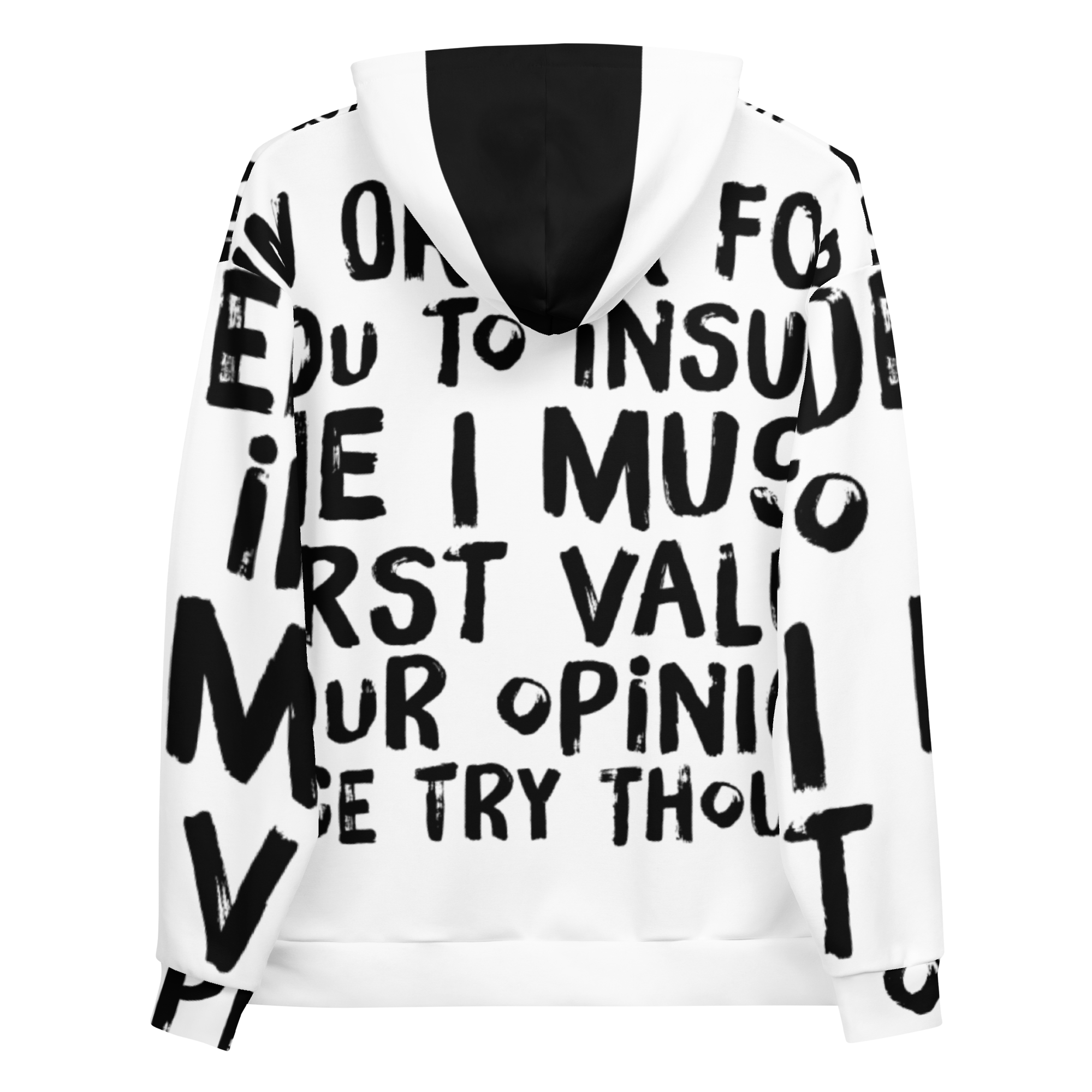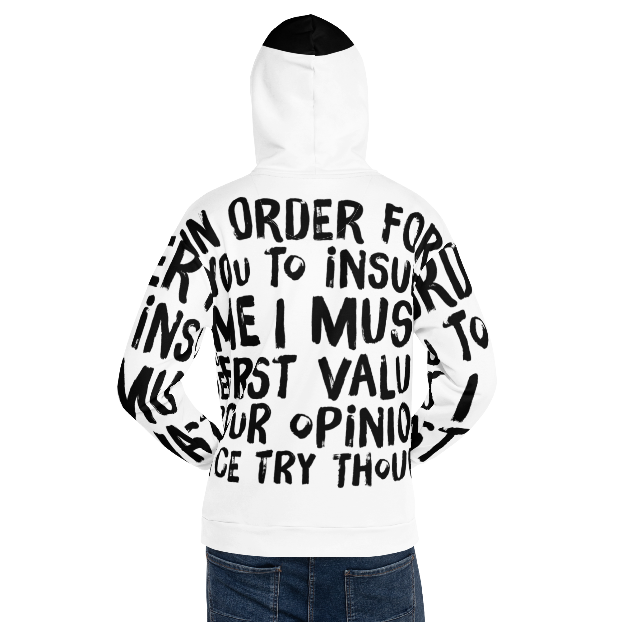 Bold and Stylish: The stark contrast of sleek black ink on crisp white, accentuated with stylish choices like a black front pocket and inside hood, makes this hoodie a head-turner. It’s not just about making a statement with words but with your entire presence.