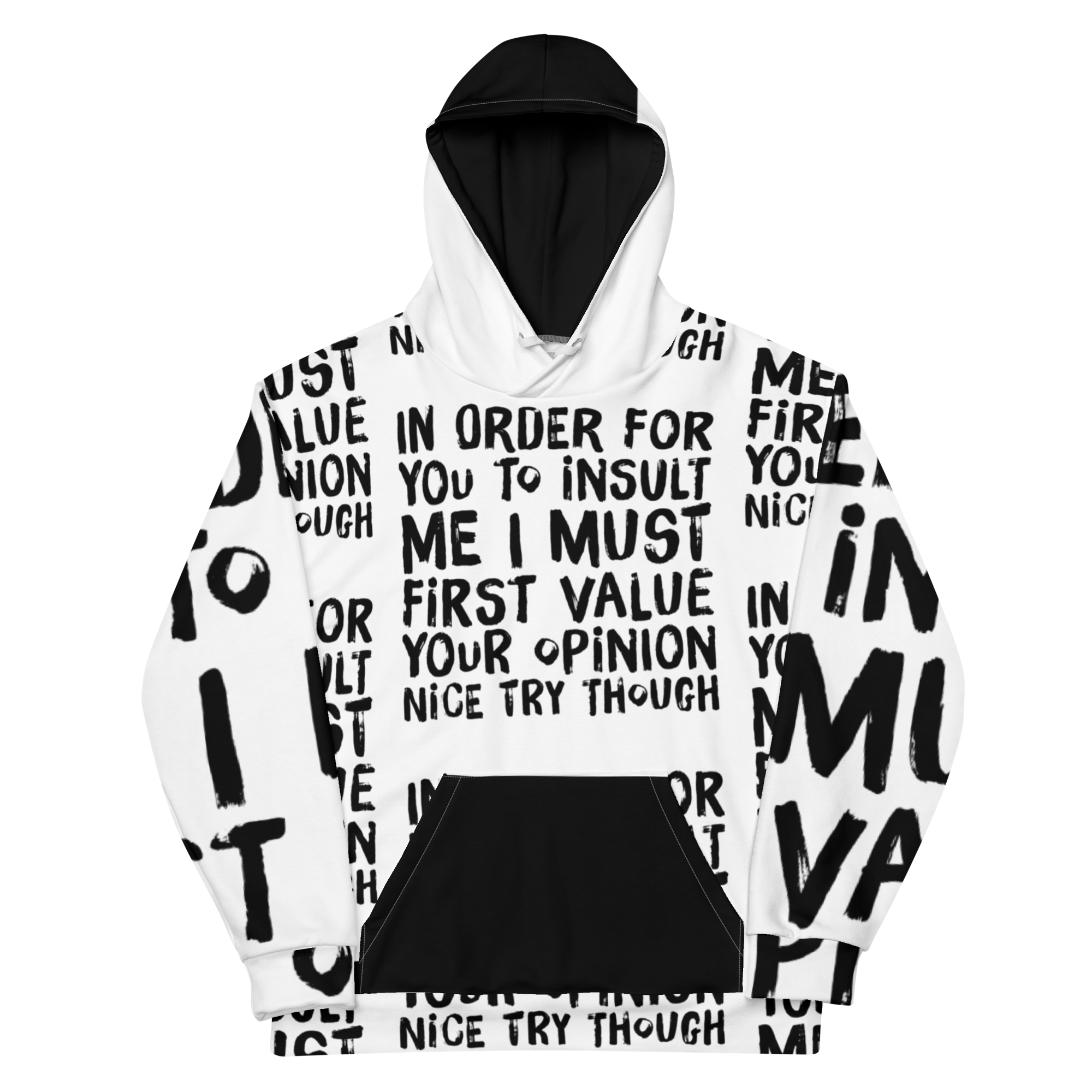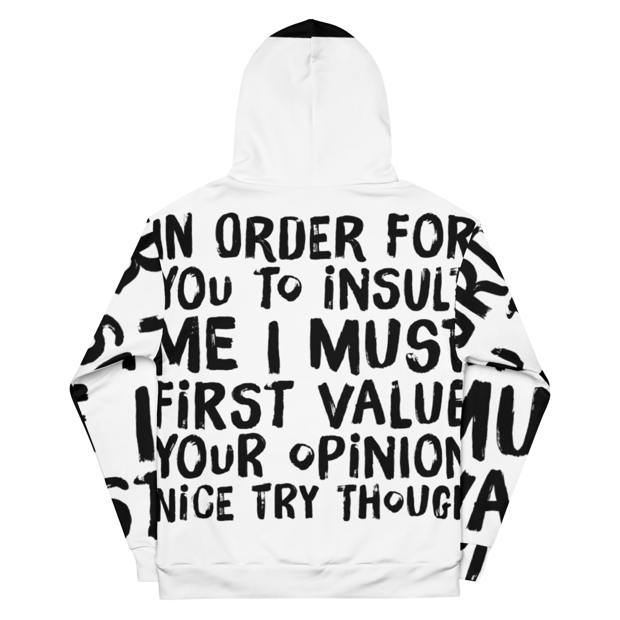 Step into a world where comfort collides with attitude with our ChillWave Eco-Friendly Unisex Hoodie. Made for those who speak their truth and live by their own rules, this hoodie isn't just a piece of clothing—it's a statement. Featuring a bold declaration, "In order for you to insult me, I must first value your opinion... nice try though", it's designed to echo the sentiments of the free-spirited and the fearless.